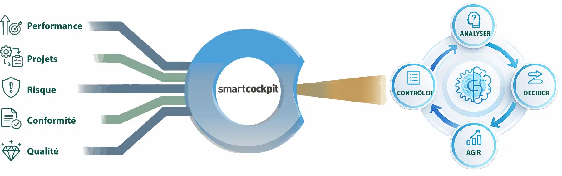 Chez smartcockpit, nous permettons aux dirigeants d’obtenir une vision équilibrée de la performance et de la santé, garantissant résilience et succès à long terme. En effet, les décideurs doivent disposer d’une vue synthétique et à 360° de la santé des activités qu’ils pilotent (performance, risque, conformité, qualité et projet).