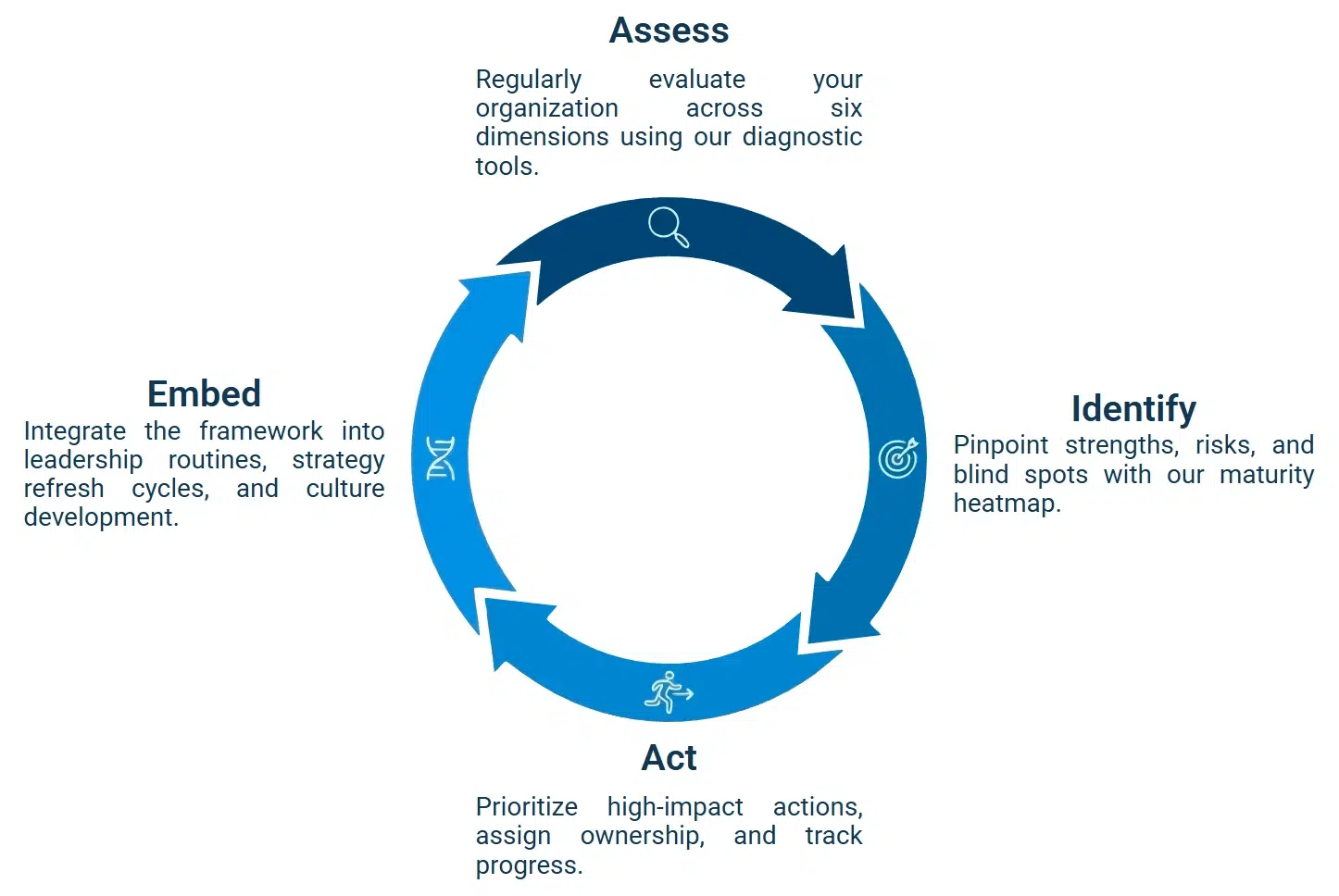Intégrez le cadre dans les routines de leadership, les cycles de révision stratégique et le développement de la culture.