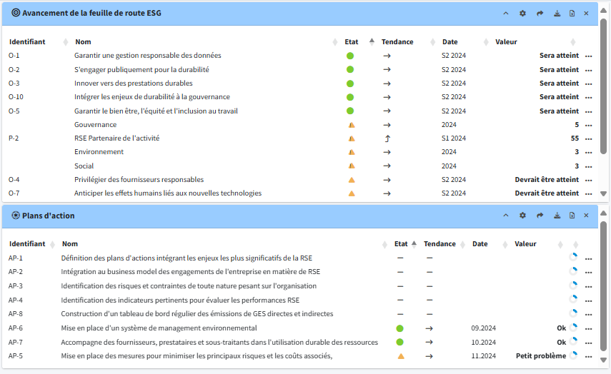 Our ESG cockpit allows you to manage the structuring and scaling up of your system. Incorporating the main guidelines of ISO 26000 and 14001 standards, you can: